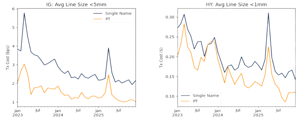 All three trends are now visible. PT volumes have hit 13% of TRACE™ volume, on track with our first prediction, and while they’ve retreated in recent months, external drivers and unexpectedly high issuance are a part of the story. The network effect continues to strengthen, with the majority of major dealers now quoting consistently and new participants filling niche roles5. Most encouraging of all, the third prediction has proven decisive: enhanced recycling technology and smarter redistribution have turned theoretical efficiency into observable liquidity benefits.